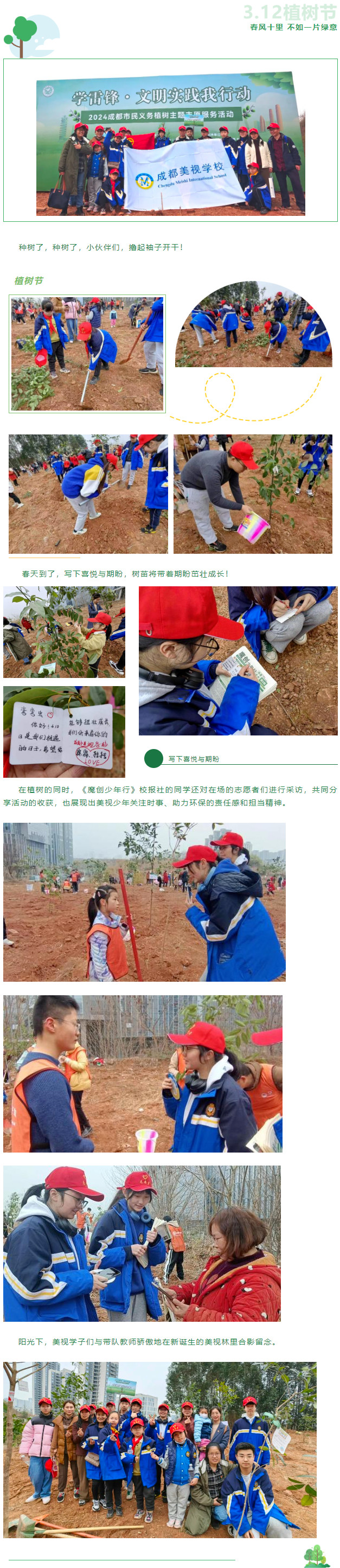 美視少年,能經風雨,多加歷練,定能成才,多元成長平臺將致力為美視學子的多樣化成長創造機會!愿同學們把本次活動的收獲運用到今后的學習和生活中,為實現美好的人生藍圖而努力!今天種下一棵樹,明天成就一幅圖!
