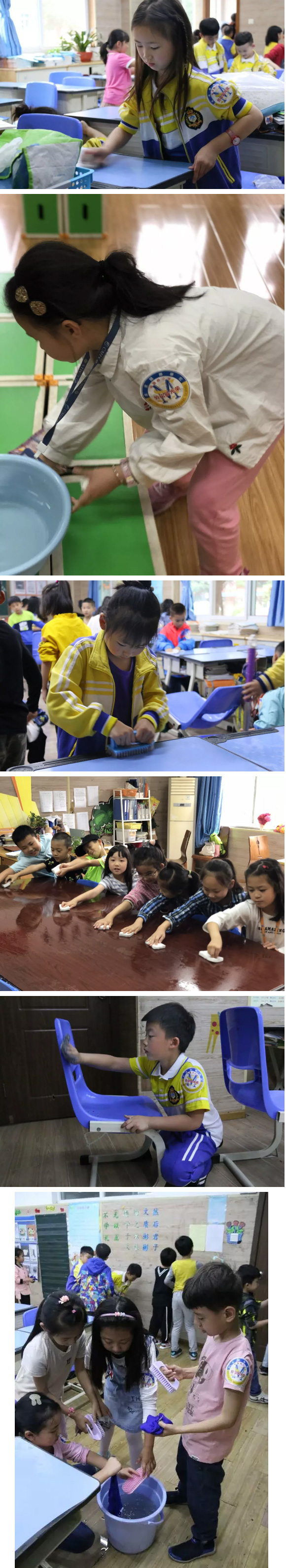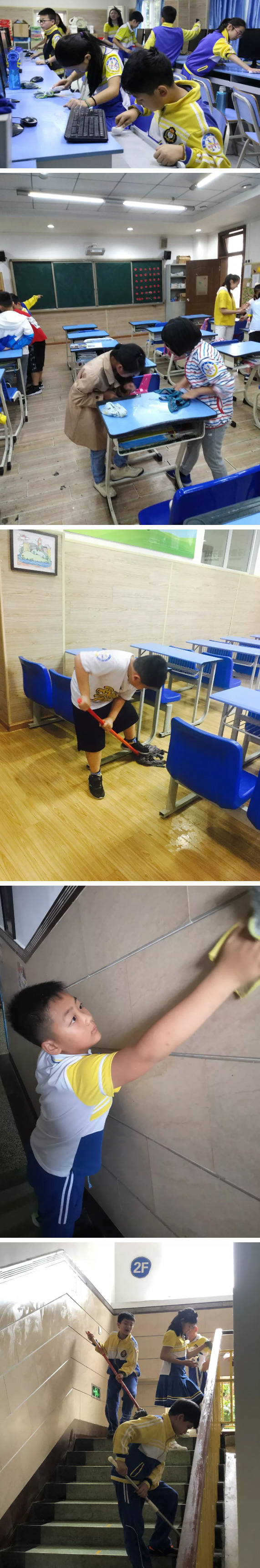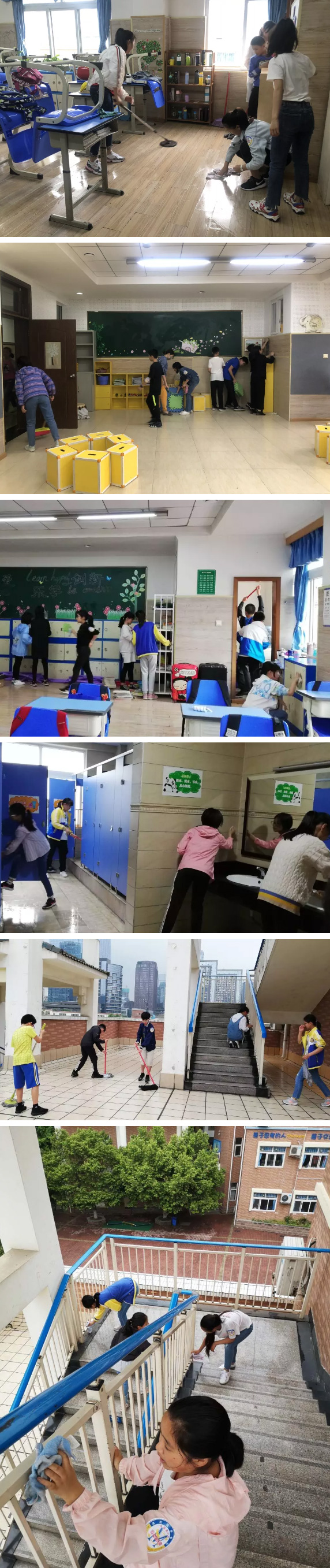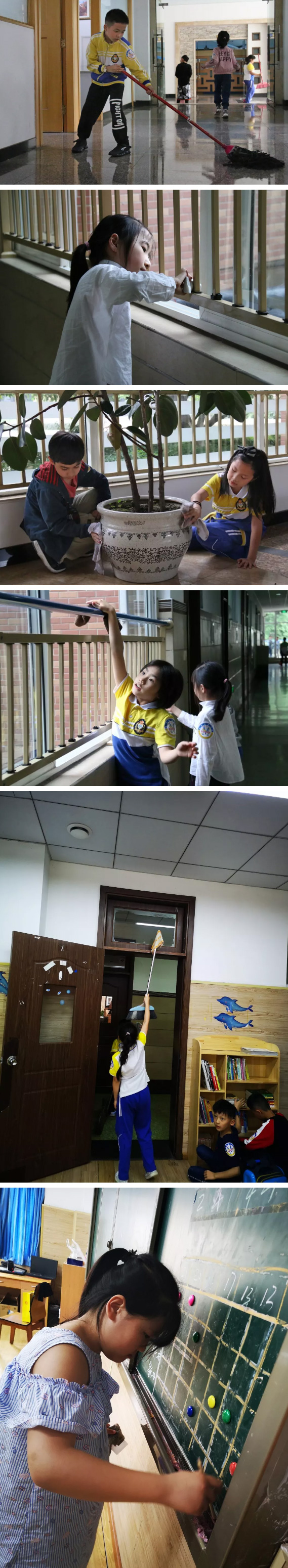 看!樓梯上躬身擦洗欄桿的身影,教室里認真打掃地面的小美寶,教學樓、圖書館、各公共區域……