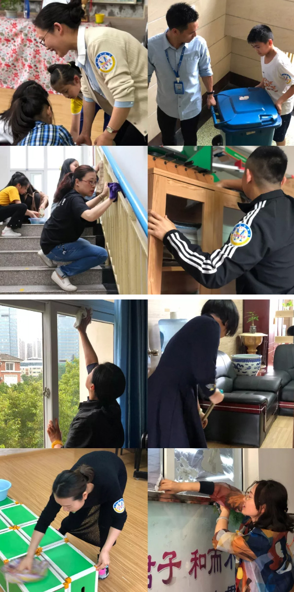 今天,他們手持拖布、掃把、撮箕、毛巾、鋼絲球……認真打掃著如家般的校園。“勞動最光榮,校園是我家。”