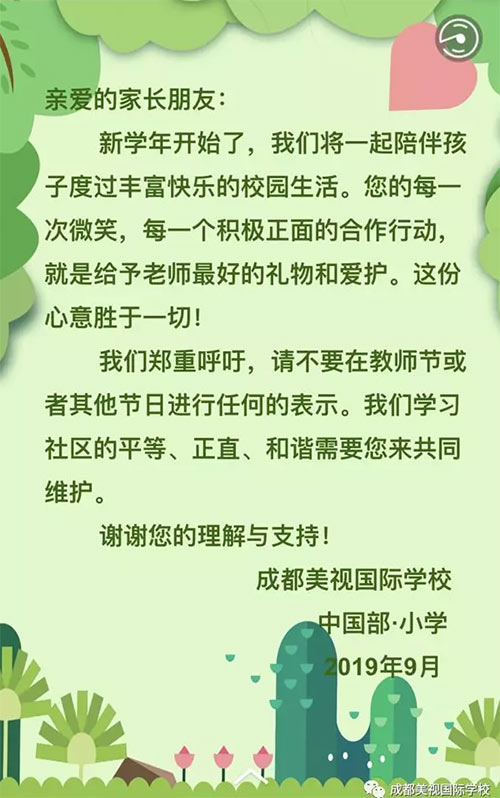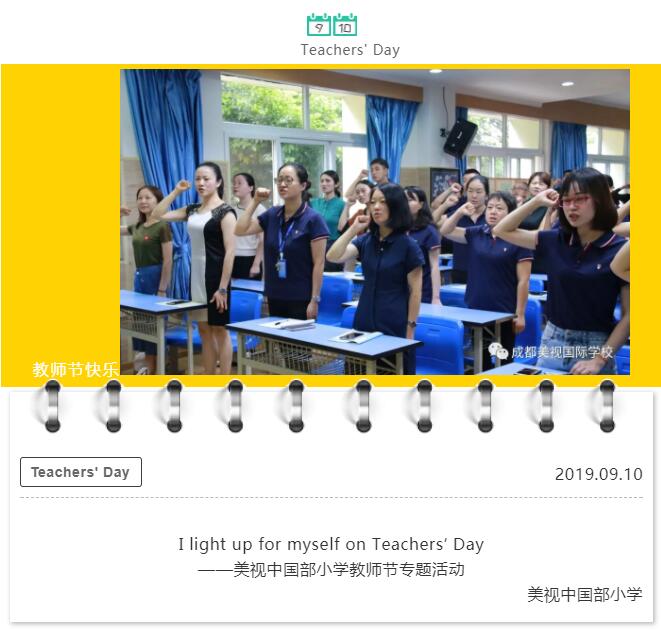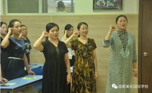 我們中國部小學全體教師在這神圣的時刻,莊嚴宣誓:師者,傳道授業解惑。在美視,我們將一如既往遵從:“既為人師,以仁愛人,以德修身,學為人師,行為示范”的準則,以嚴謹、務實的態度與孩子們共度幸福完整的教育生活。