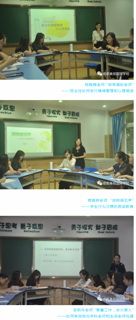 今天的班主任會非常特別,三位非常有經驗的班主任分別就“學生的行為養成,和學科、生活老師的溝通與互助,自我情緒的有效管理”三方面,為我們做了分享,引發了我們的思考。