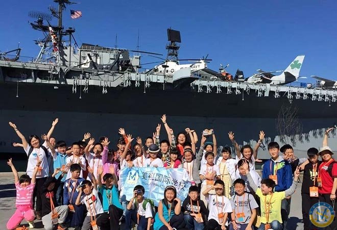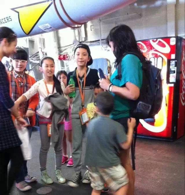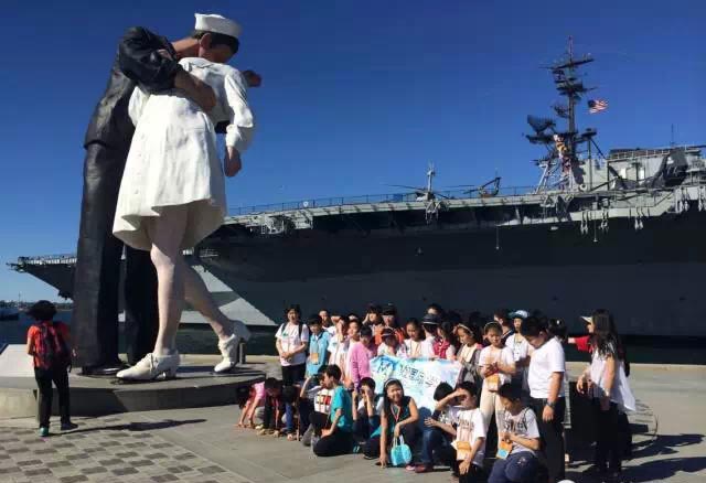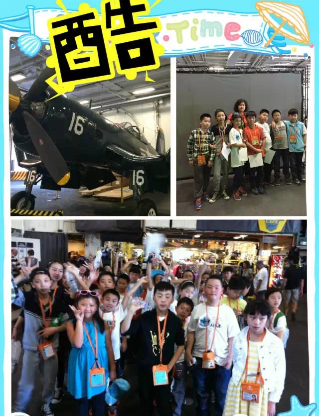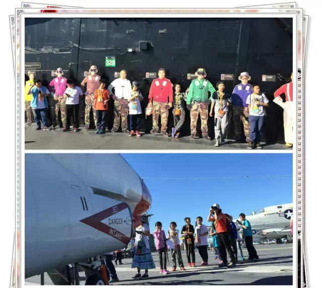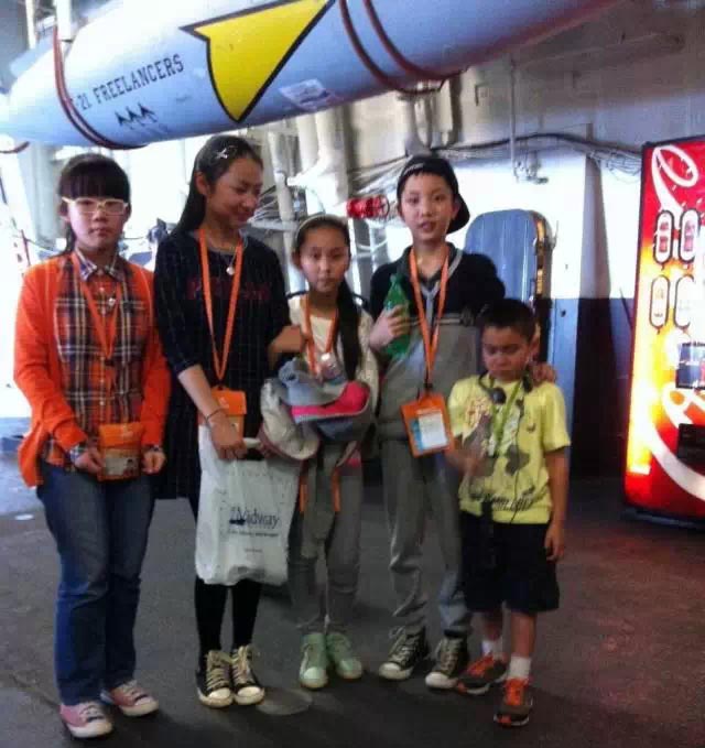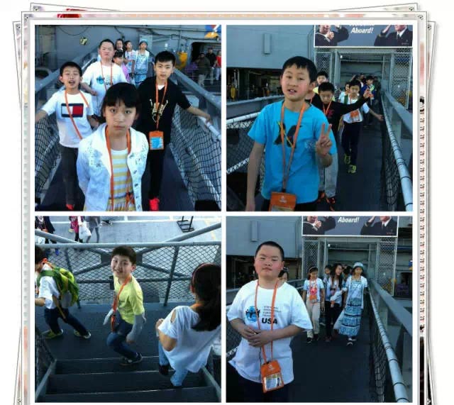 午餐過(guò)后,營(yíng)員們參觀了“中途島號(hào)”航空母艦,途中還發(fā)生了一個(gè)小插曲:有個(gè)美國(guó)孩子被鎖住了,我們的小朋友發(fā)揚(yáng)國(guó)際主義友愛(ài)精神,紛紛安慰他。美視的小朋友,贊一個(gè)!