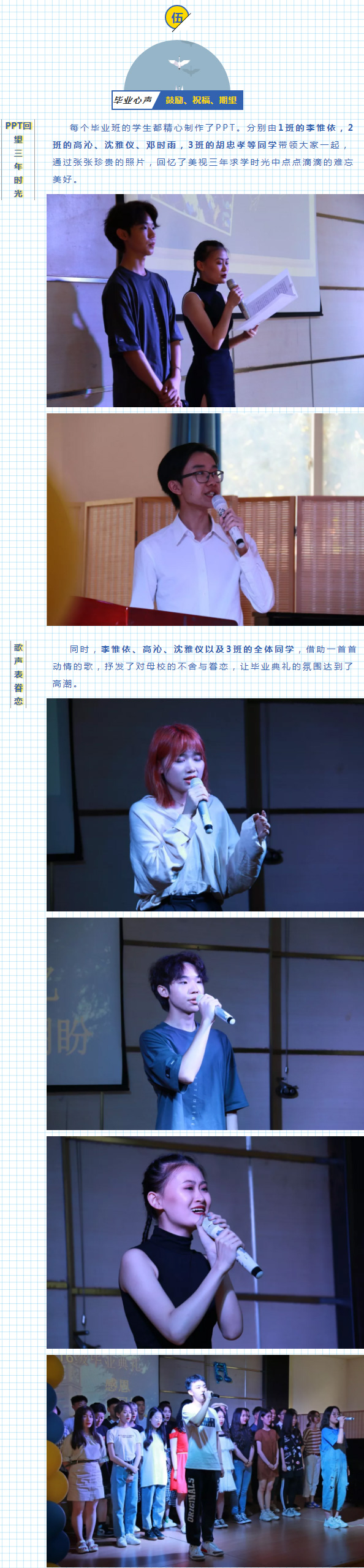 在主持人楊佳琳和顏復(fù)明兩位同學(xué)熱情而莊重的開場詞中,以“回憶、感恩、期盼”為主題的畢業(yè)典禮正式開始。
