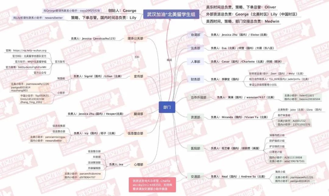 武漢加油·北美留學生組綜合資源部部長對整個組織運行的簡單概括:由綜合資源部(由交通組、采購組、醫院組、信息組、合作對接組組成)和綜合公關部(由宣傳組、公關組、翻譯組、法務組組成)。兩部門協同運作將物資直接對接到醫院,具體流程為信息組收集分類信息、采購組聯系貨源方、審查組審核貨物是否合格、醫院組向醫院核對是否接受、交通組負責運輸到醫院,醫院簽收并反饋。遲駿杰在其中前期是做的國內負責人的助理,后期是信息部交通對接組的負責人,前期他就主要是負責接觸外部人員,如想要參加志愿的人,醫院來的求助者,以及貨源信息提供者,捐贈者,記者,政府人員,后期物資都到位之后,遲駿杰便轉去負責一些與交通組對接的事宜了。