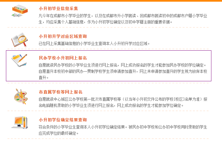 1、登陸“成都市小升初服務(wù)平臺(tái)”后,選擇“民辦學(xué)校小升初網(wǎng)上報(bào)名”。