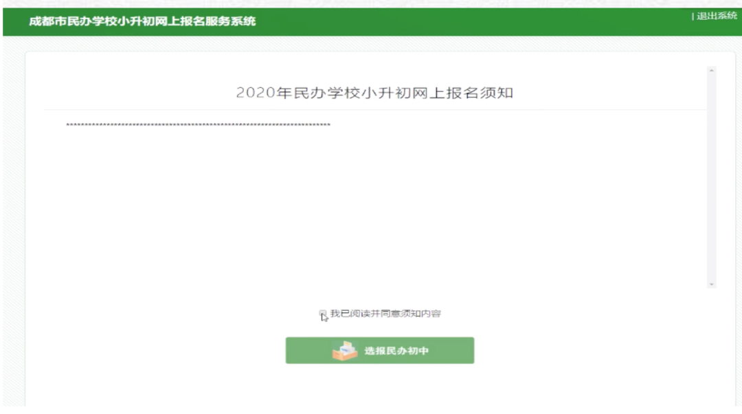 2、請(qǐng)仔細(xì)閱讀 “2020年民辦學(xué)校小升初網(wǎng)上報(bào)名須知”內(nèi)容。閱讀完畢后勾選“我已閱讀并同意須知內(nèi)容”,并點(diǎn)擊“填報(bào)民辦初中”。