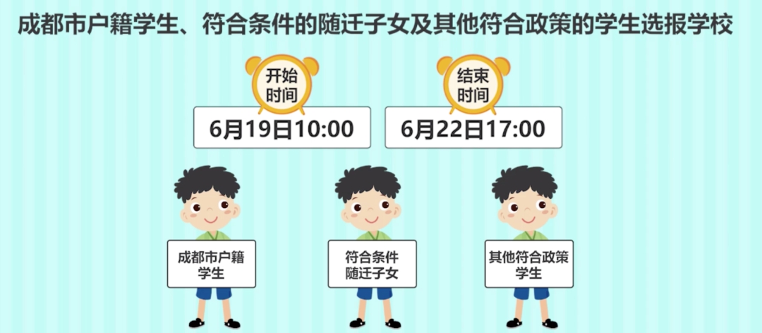 2020年6月19日10:00-6月22日17:00,成都市戶籍學(xué)生、符合條件的隨遷子女及其他符合政策的學(xué)生進(jìn)行民辦初中網(wǎng)上報(bào)名。