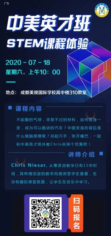看到這里,或許您想問中美英才班到底是怎樣的項目呢?7月18日,參與中美英才班STEM課程體驗,走進中美英才班日常課堂,與外教Chris一起動手進行模型探究與設計制作!